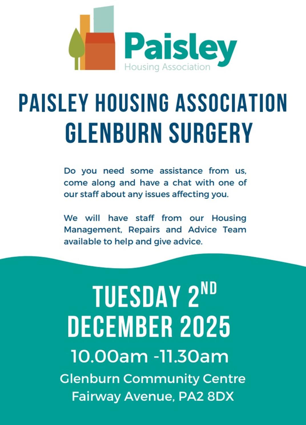 Paisley Housing Association is hosting a surgery in you community, this is your opportunity to drop in, meet our staff and discuss any issues with your home. All on your doorstep.