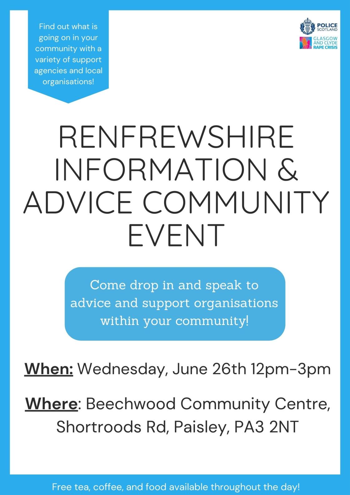 Police Scotland are holding a partnership community event within Renfrewshire on Wednesday 26th June between 12 pm and 3 pm. The aim of this event is to allow members of the public to come along and speak to or seek advice from a variety of local organisations. These events will allow local organisations within the area to network and raise awareness of their organisation. You can drop in anytime between 12pm and 3pm and free tea/coffee, food, and other freebies will be available throughout the day!