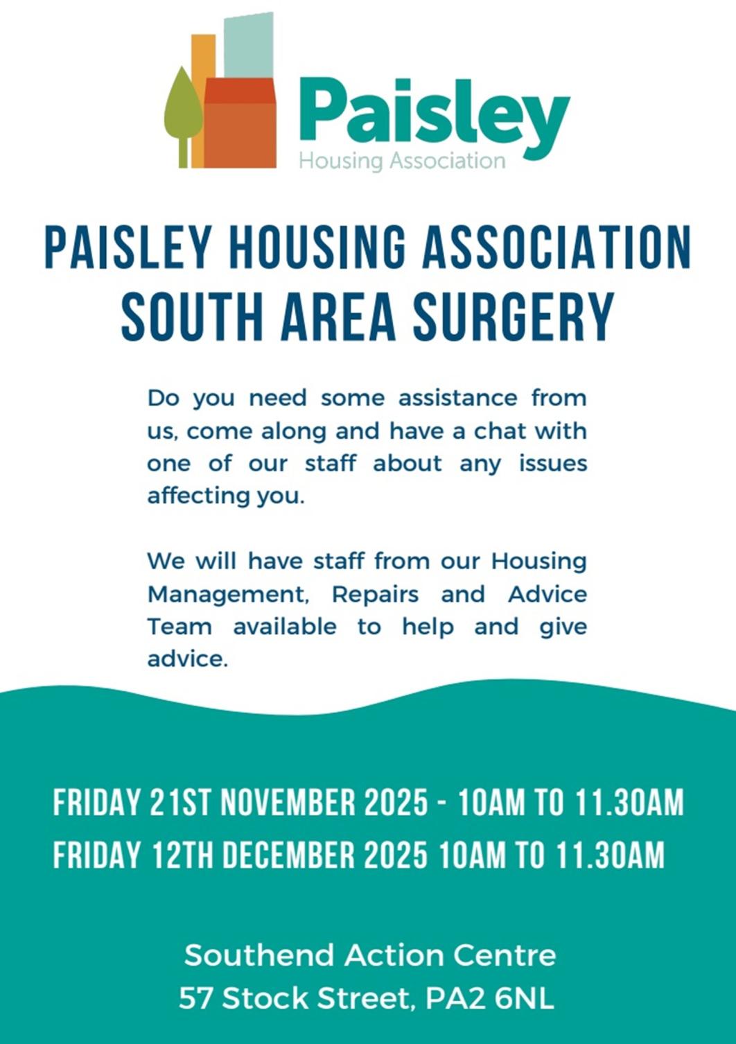 Paisley Housing Association is hosting a surgery in you community, this is your opportunity to drop in, meet our staff and discuss any issues with your home. All on your doorstep.