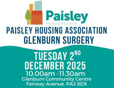 News Click here to view the latest edition of our bulletin Glen Burn Surgery Tuesday 2nd December 2025 Paisley Housing Association is hosting a surgery in you community, this is your opportunity to drop in, meet our staff. South Area Surgery 21st November & 12th December 2025 Paisley Housing Association is hosting a surgery in your community, this is your opportunity to drop in and meet our staff. Paisley Housing Association Foxbar Area Surgery Thursday 13 November 2025 Paisley Housing Association is hosting a surgery in your community, this is your opportunity to drop in and meet our staff. Welcome to DigiKnowVember 2025! Renfrewshire’s month-long digital inclusion drive with 150+ events to help people learn, connect, and explore digital opportunities. Annual Report and Landlord Report 2024-25 Paisley Housing had a busy and successful year in 2024–25, and this report shares key achievements and performance highlights. Creative Cuppa RIG Arts Event Renfrewshire residents are invited to a free, all-ages Paint Party hosted by RIG Arts this Friday, 17 October 2025, from 1:30PM to 4:30PM Art Wise Free art sessions for parents and children aged 4-11 Paisley Housing Association Surgeries Multiple Dates Paisley Housing Association is holding surgeries in you community, this is your opportunity to drop in and meet our staff Get Involved in Our Resident Voice Panel Its an exciting time to join our Resident Voice Panel Summer Newsletter 2025 We’re excited to launch our very first Digital Newsletter! Get involved — become a PHA Member for just £l! Help us to help you to share your community by being a member of the Association. Get Safe Online Student Campaign September 2025 Starting uni means your life goes digital fast — from lectures to late-night group chats. Stay sharp online with simple safety tips The STAR Project: Autumn 2025 Update The START Project Autumn programme has a number of events scheduled for the Autumn 2025